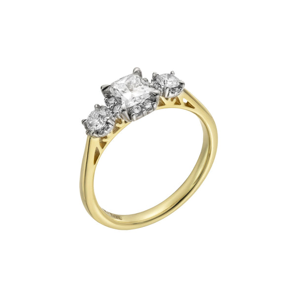 18ct Yellow Gold Cushion Cut Diamond Three Stone Halo Ring, 1.19ct