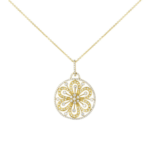 18ct Yellow & White Gold Diamond Circular Flower Filigree Design Pendant