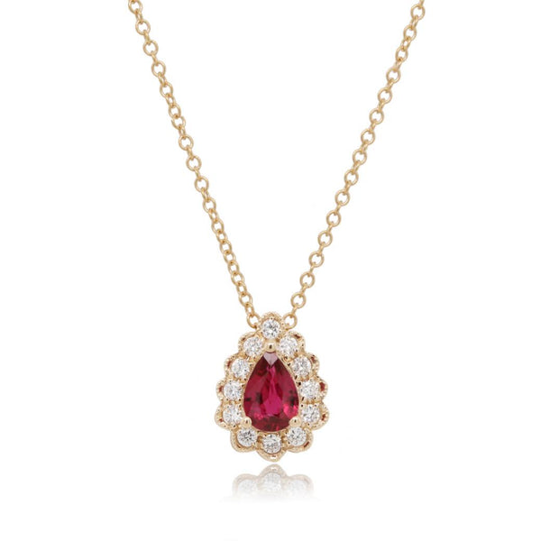 9ct Yellow Gold Pear Cut Ruby & Diamond Halo Pendant