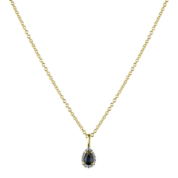 9ct Yellow Gold Pear Shape Sapphire & Diamond Halo Pendant