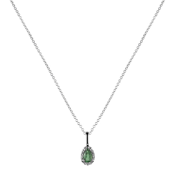 9ct White Gold Pear Shape Emerald & Diamond Halo Pendant