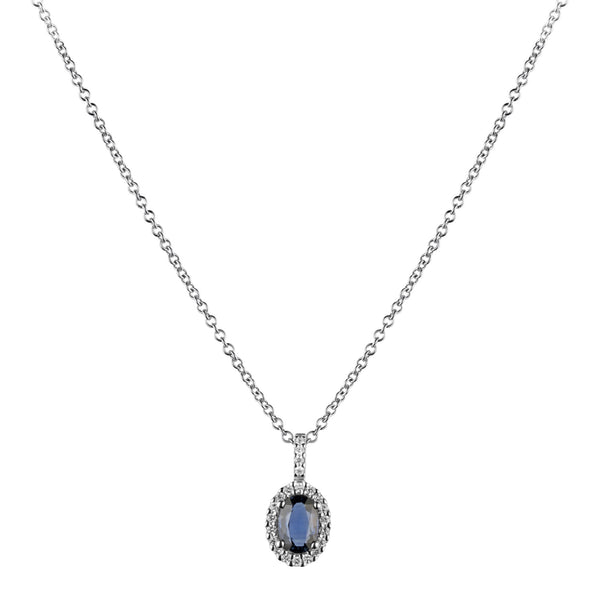 9ct White Gold Oval Sapphire & Diamond Halo Cluster Pendant