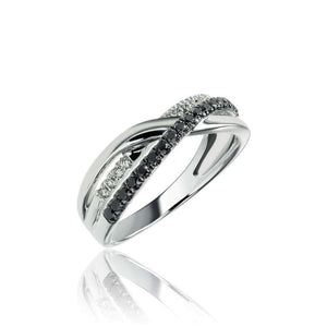 18ct White Gold Three Strand Black and White Diamond Set Crossover Dress Ring, Row of Round White Diamonds With a Total Weight of 0.13ct, Row of Treated Black Diamonds With a Total Weight of 0.24ct, Combined Total Diamond Weight 0.37ct, Finger Size M 1/2 & Size O in stock.