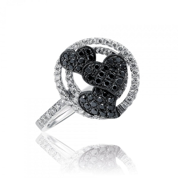 18ct White Gold Double White Diamond Circles with Three Black Diamond Hearts In Centre, Round White Diamonds Total Weight 0.36ct, Round Black Diamonds Total Weight 0.31ct, Finger Size M.