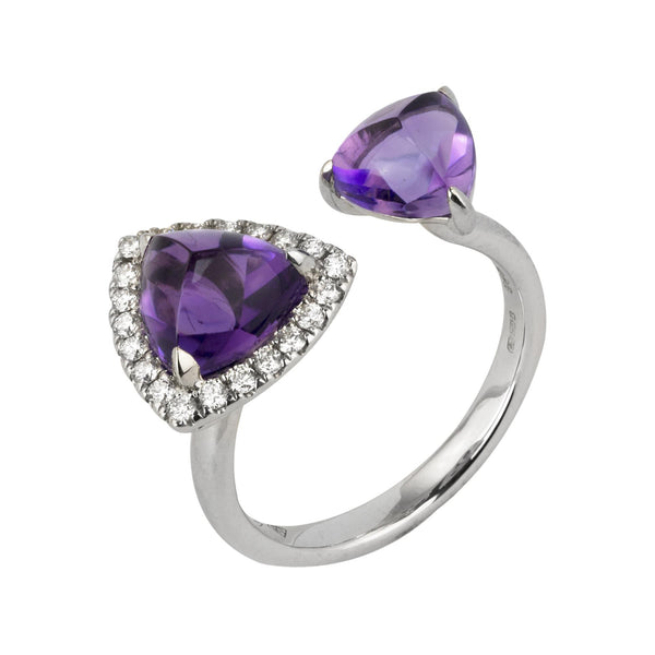 18ct White Gold Diamond and Amethyst Torque Dress Ring Two Triangle Shaped Amethysts One With Diamonds Around Outer Edge Round Cut Diamonds Total at 0.25ct Total Amethyst Weight at 3.20ct All Claw Set
