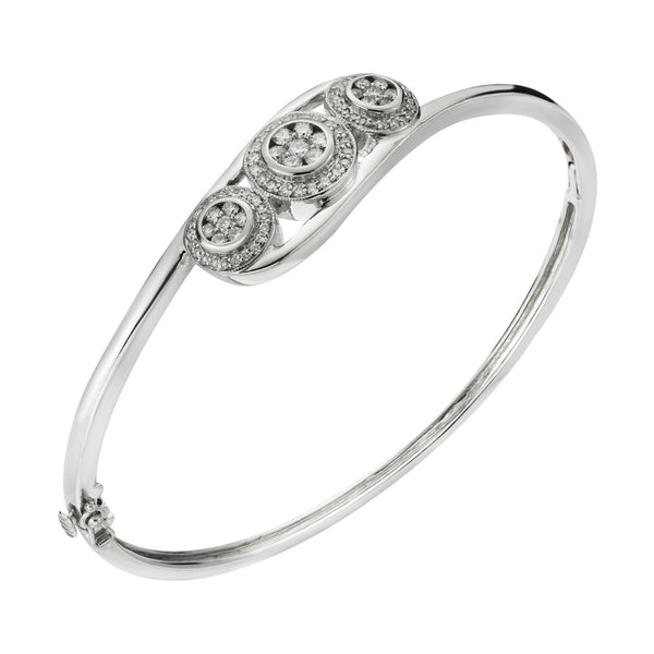 18ct White Gold Diamond Hinged Bangle, Three Pave Diamond Clusters Set In A Twist, Total Diamond Weight: 1.12ct.