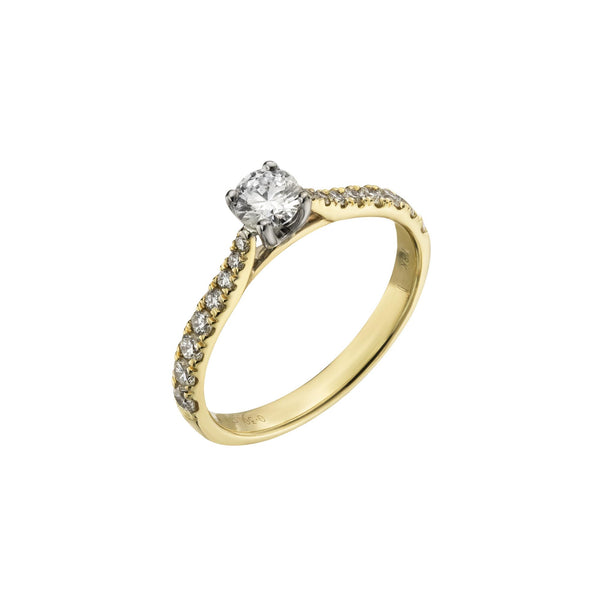 18ct Yellow and White Gold Solitaire Diamond Ring with Tapered Diamond Shoulders at 0.30ct Grain Set Round Brilliant Diamond Four Claw Set at 0.30ct Approximate Colour G/H and Clarity Si Total Diamond Weight at 0.60ct Size M