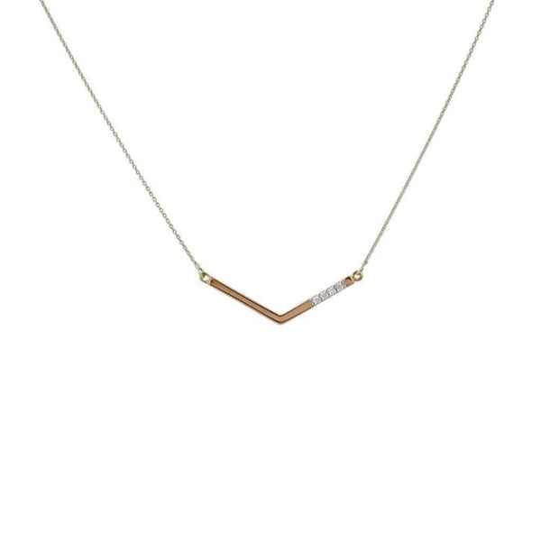 9ct Rose and White Gold "V" Shaped Bar Necklace with 16"Chain, Four Round Cut Diamonds Claw Set Total at 0.03ct