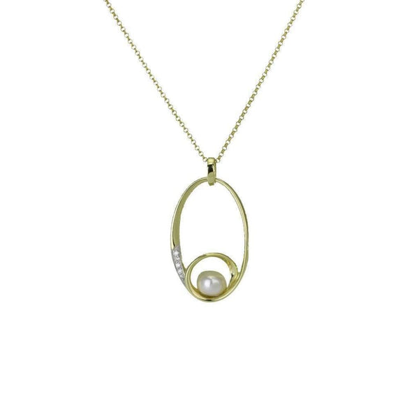 9ct Yellow Gold Open Oval Swirl Pendant Diamond Set with Freshwater Button Pearl in the Centre on an 18" Chain