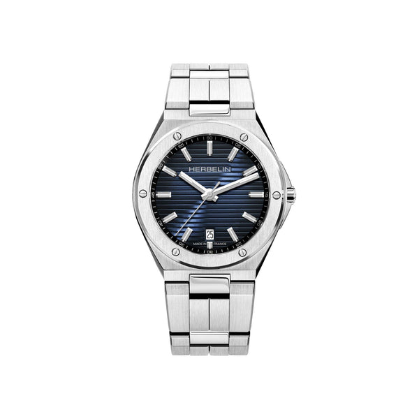 Blue dial with baton markers, date window at 6 o'clock.