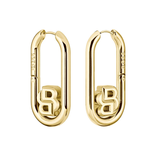 Boss Double B Swing Stainless Steel Gold Tone Monogram Hoop Earrings