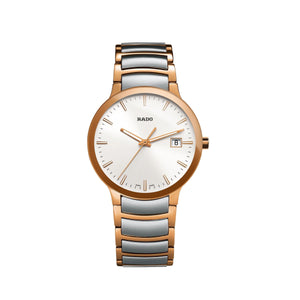Rado Centrix watch. Stainless steel & Rose Gold plated case and bracelet. 38mm case diameter. Silver dial with baton markers. Sapphire crystal glass, swiss quartz movement. Water resistant 3 bar (30m)