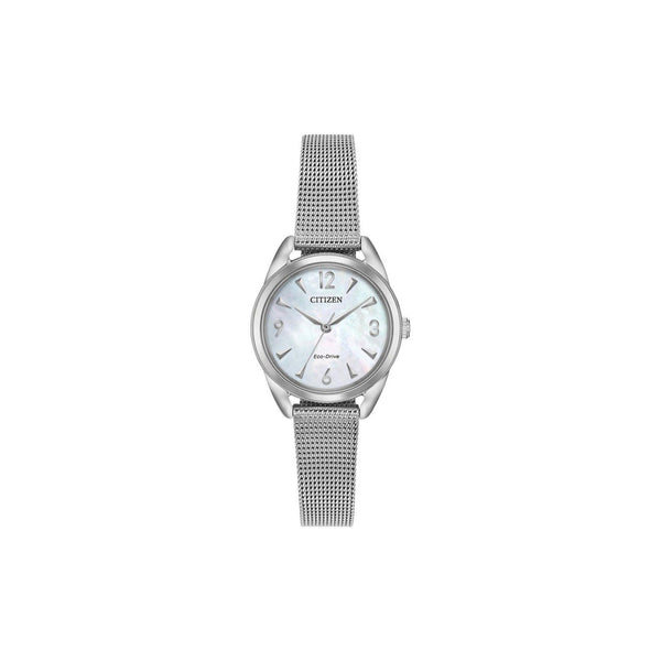 Citizen Ladies Eco-Drive Watch. Stainless steel case & mesh bracelet. 27mm case diameter, white mother-of-pearl dial with arabic numerals and baton markers. Eco-Drive light powered quartz movement. Splash resistant
