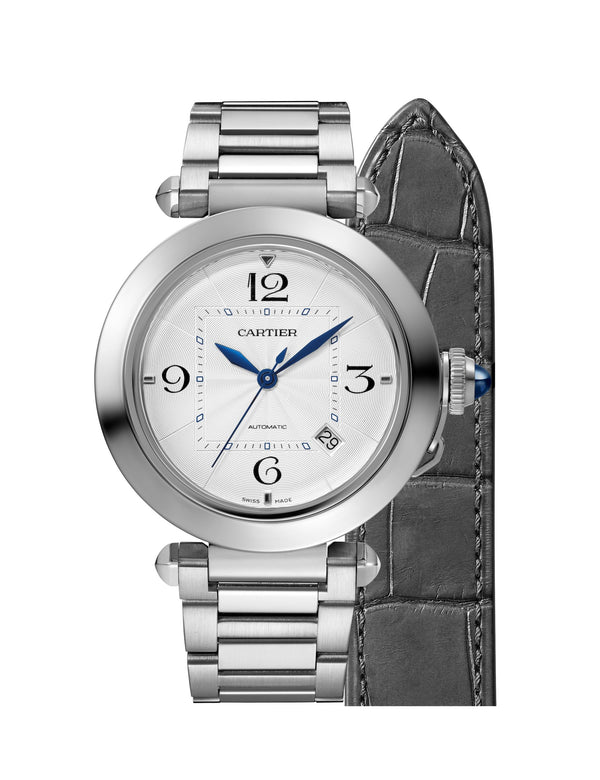 Cartier Pasha Watch. Stainless steel case on steel bracelet. Extra dark grey alligator leather strap with folding clasp. 41mm case diameter. Silver dial with arabic numerals. Sapphire crystal glass. Self-winding mechanical movement. Water resistant 100m