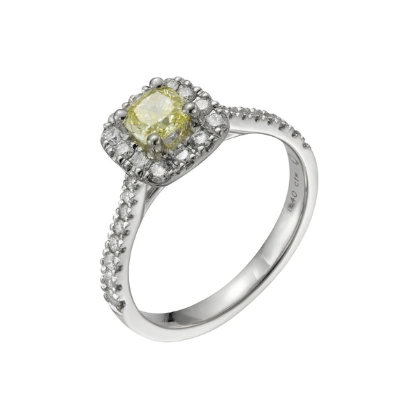 Platinum Cushion Cut Yellow Diamond Halo Ring, 0.92ct