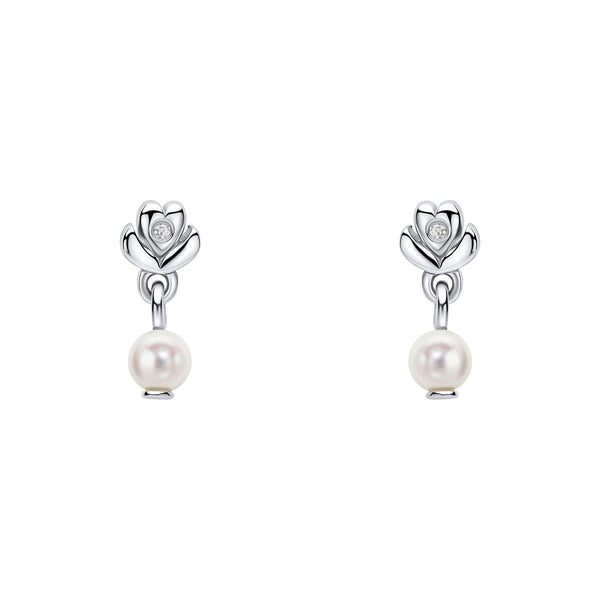 Silver Diamond & Freshwater Pearl Flower Drop Earrings