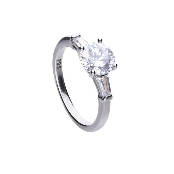 Sterling Silver Three Cubic Zirconia Ring, One Round Cubic Zirconia in The Centre and Two Outer Baguette Cubic Zirconias.
